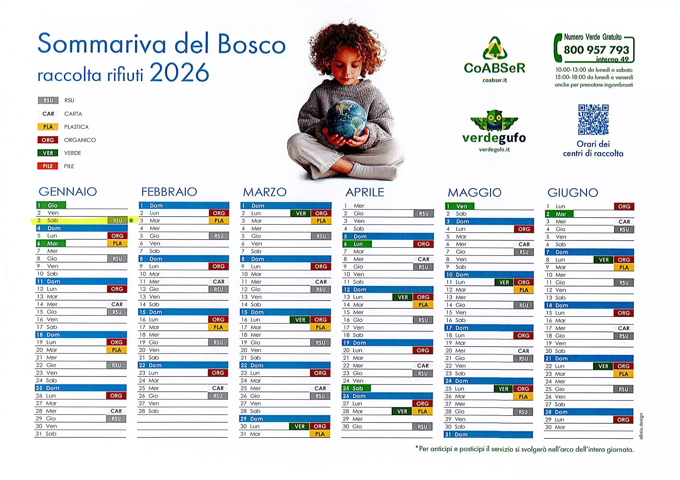 si comunica che a causa di un imprevisto tecnico, non si garantisce la consegna porta a porta dei calendari relativi alla raccolta dei rifiuti, entro il 31/12/2025. Essa verrà effettuata entro il mese di Gennaio 2026.